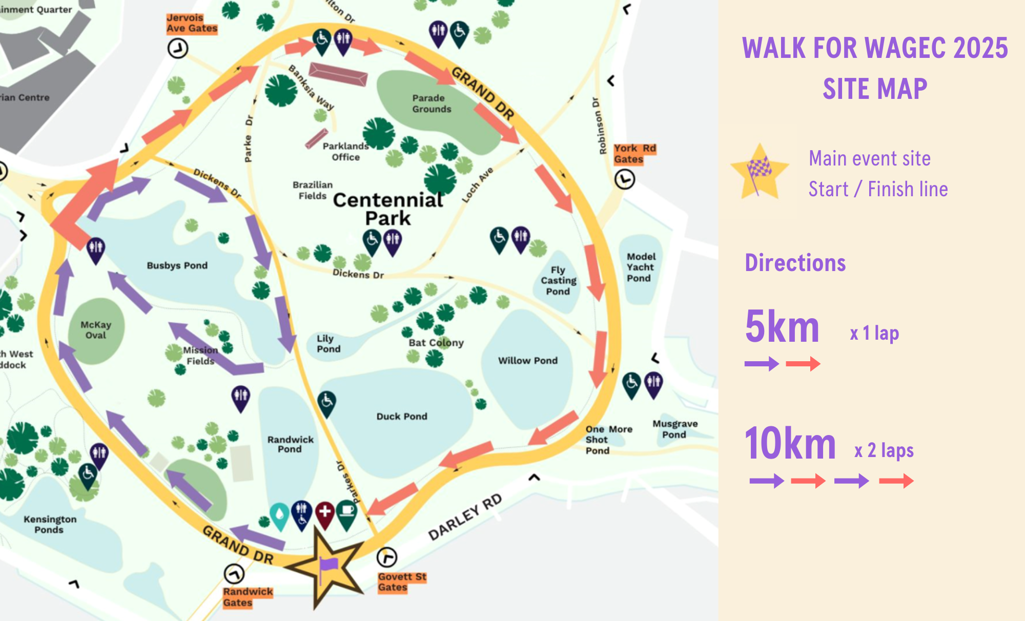 We encourage people who use wheelchairs and people with prams to use the paved pathway throughout the course. Our staff can provide assistance on the day. If you have any accessibility needs, please get in touch with us via walk4wagec@wagec.org.au.
